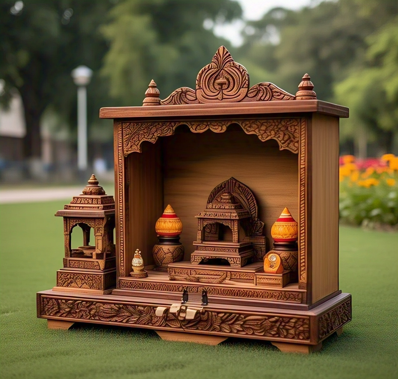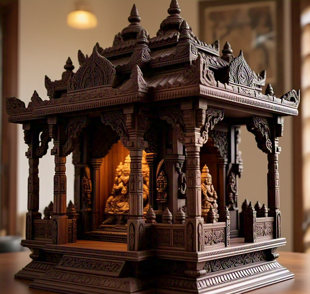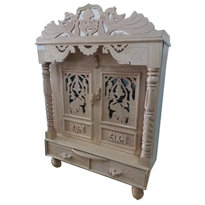 Wooden temple furniture combines traditional Indian architecture with modern functionality. Made from durable hardwoods, these pieces feature intricate carvings and ornate details. Portable and versatile, they can be used as decorative pieces in homes, offices, or shops, adding a touch of spirituality and cultural elegance.